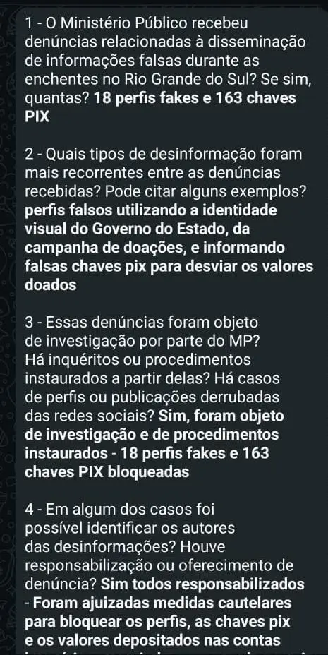 Ainda segundo Panzenhagen, ao longo do período das enchentes a Polícia Civil prendeu 13 pessoas por aplicarem golpes na internet, não exclusivamente utilizando perfis falsos do governo. Isso ocorreu devido a uma articulação do Núcleo de Combate à Desinformação, criado dentro do Gabinete de Crise de Comunicação do governo do Estado, que atuou com a Polícia Civil e o Ministério Público para investigação de perfis falsos e conteúdos criminosos. Os casos comprovados foram encaminhados para responsabilização judicial.